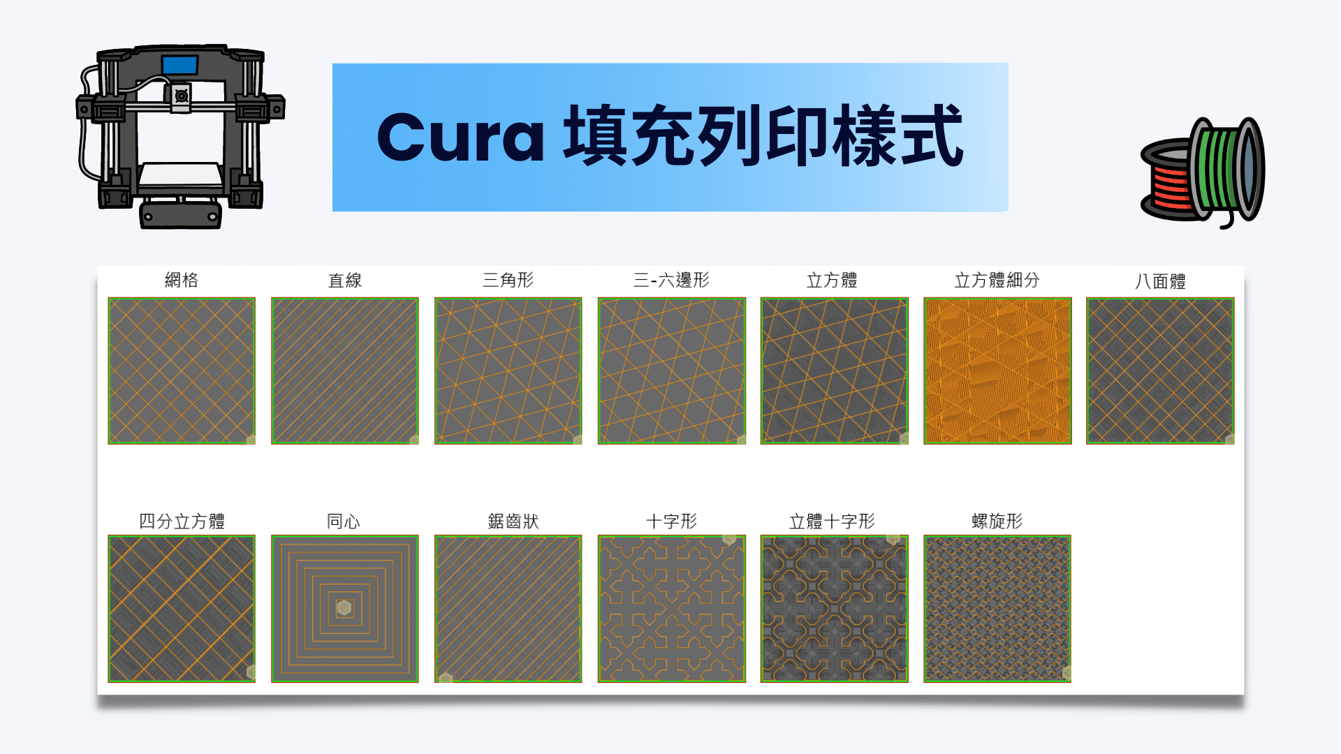 使用 Ultimaker Cura 4.2.1 版本,將填充列印樣式以清單順序列出,並…