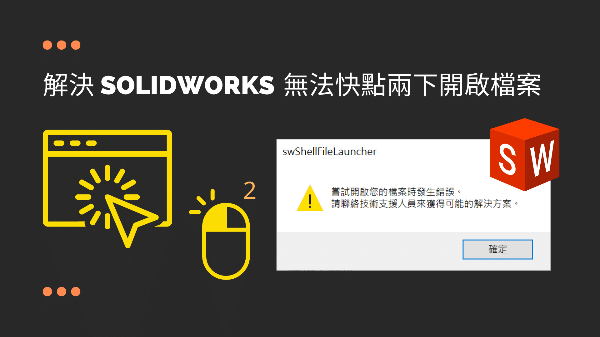 系統解決 SolidWorks 無法快點2下開啟檔案的方法 (2022)發佈 :2020-11-13更新 :2023-08-25在 Windows 檔案總管或桌面快點 2 下開啟 SolidWorks 檔案,但顯示 s…